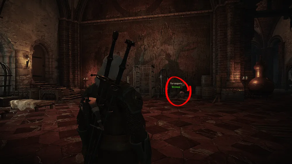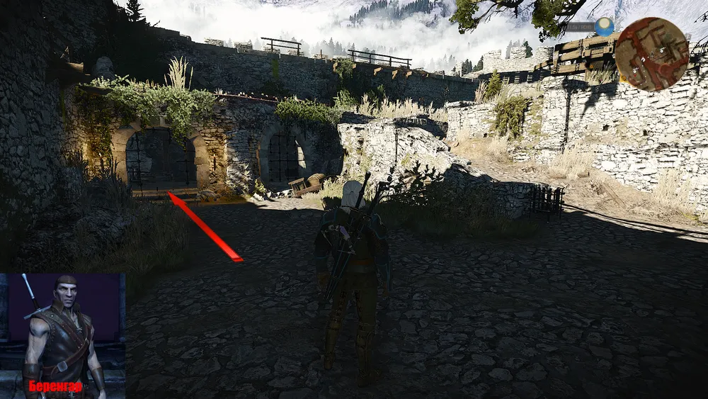 Внимание! Обсудить с Весемиром клинок Беренгара можно будет только после первой беседы с Йеннифэр в рамках основного квеста «Помехи». Достаточно получить от нее задание найти источник энергии, нарушающий работу мегаскопа, и Весемир вместе с Умой переместятся с нижнего двора крепости в зал на первом этаже замка (11). Пока же он сидит с Умой на улице у ворот, побеседовать с ним будет невозможно.
