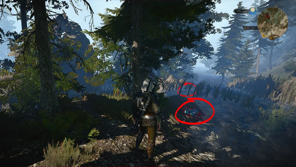1. Если за невесть какой надобностью вашего Геральта занесет к хате на берегу озера, за ней он вполне может наткнуться на тушки двух дохлых утопцев (2). Осмотр одной из них с помощью ведьмачьего чутья активирует данный квест. Судя по повреждениям, разделался с ними не человек, а некто значительно более крупный и сильный, а стало быть, и весьма опасный. Кто бы это мог быть? Попробуем выяснить.