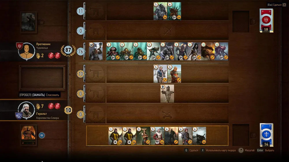 - 2. Хмырь в синей шляпе за столом у стены оказался самым придирчивым. В диалоге с ним больше всего опций, однако договориться сыграть с этим занудой вполне реально, если строго избегать варианта ответа с упоминанием Ублюдка. Играет сей господин колодой Чудовиш. Карта-лидер - Эредин Бреакк Глас Король Aen Elle (позволяет удвоить силу всех рукопашных отрядов). У него изрядное количество карт с бонусом "Двойник", поэтому самое лучшее, что вы можете сделать, - в первом раунде вынудить его выложить на стол как можно больше карт, а потом благополучно раунд слить. Если вам удастся сохранить при этом свои наиболее сильные карты, то второй и третий раунды останутся за вами.