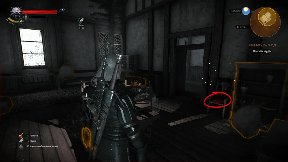 1. Дом (12), в котором Геральт надеялся застать Корину, находился недалеко от Рыбного рынка и принадлежал банкиру Рудольфу де Йонкеру. Владелец (он встретил ведьмака у входа в дом) опасался, что доставшийся ему за кругленькую сумму объект недвижимости проклят. Нанятая им онейромантка должна была увидеть во сне историю дома и выяснить, насколько оправданы опасения хозяина, но что-то явно пошло не так. Когда Геральт нашел сновидящую, над ней стояло какое-то маленькое существо и производило руками непонятные манипуляции. Завидев ведьмака, оно шмынуло под кровать и исчезло. Сама Корина металась в кошмаре, не в силах проснуться. Словно в бреду она твердила о чердаке и кукле. Похоже, господин де Йонкер не так уж и ошибался. С домом точно было не все в порядке, и Геральт решил выяснить, что тут, во имя Пресвятой Мелитэле, происходит. Первым делом он отправился на чердак.