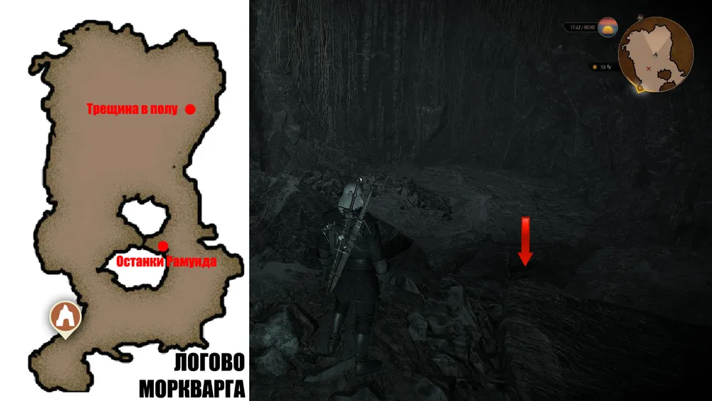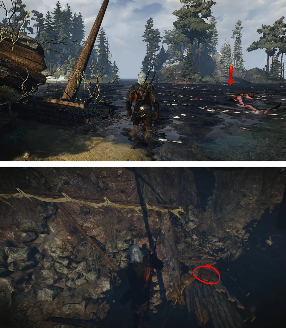 Пещерка, где всплывет Геральт, патрулируется двумя гаргульями (13 уровня) и таит в себе сундучок с лутом, а также останки неудачников, пренебрегших советом Гуннара не всплывать.