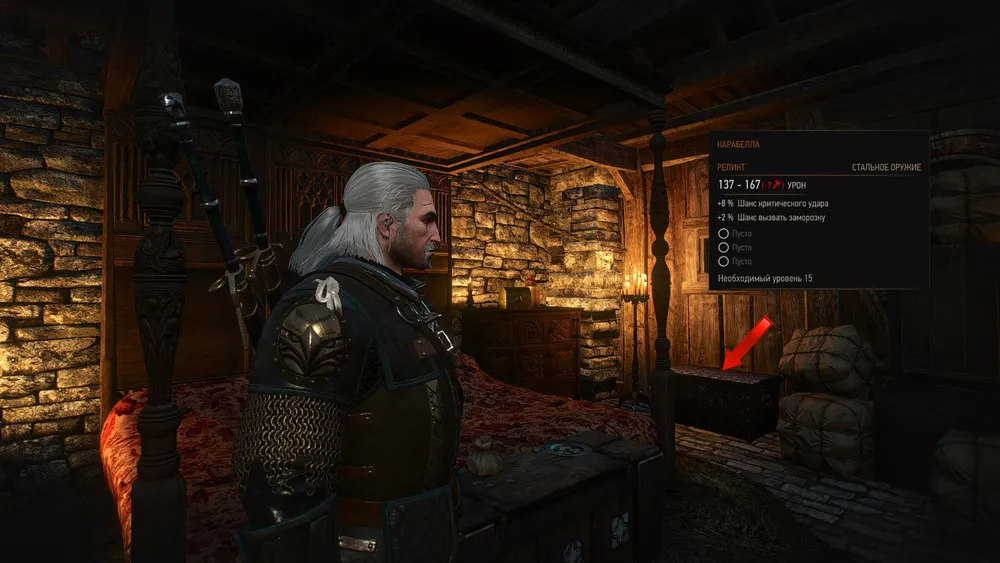 1. В жилище главаря и правда отыщется много чего интересного. В основном это будут компоненты для крафта и алкоголь. Главная же находка – стальной реликтовый меч Карабелла, рассчитанный на персонажа уровня 15+. Ищите его в спальне, в кованом сундуке. Со сбором лута в деревне советую не затягивать, потому что довольно-таки скоро ее займут островитяне, и их стражники не позволят ведьмаку безнаказанно шарить по бочкам, ящикам и тюкам.