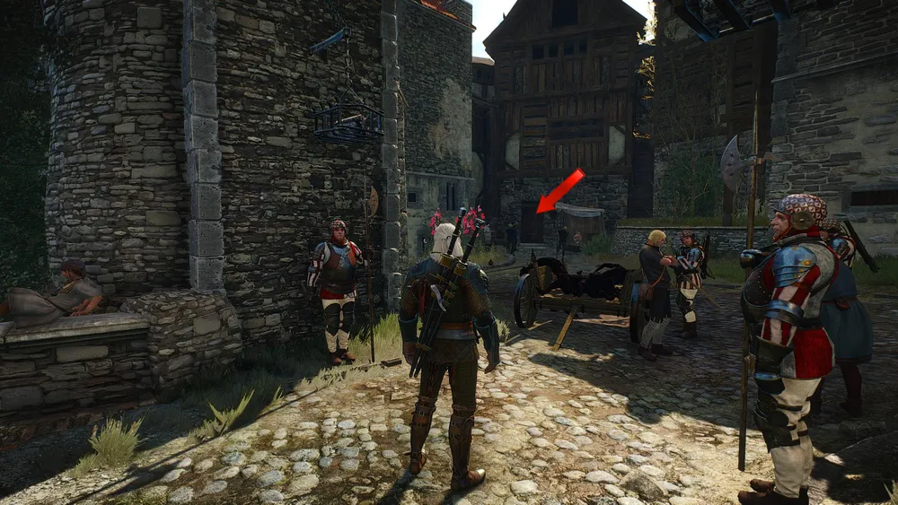 - Если Геральт подыграет горе-дозорным (реплика: «Идем»), то они проводят его к своему боссу для дальнейшей беседы.