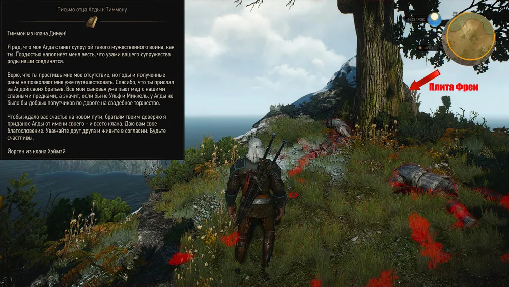 Ступайте по ним, и они приведут вас к дереву над обрывом (6). Под ним ведьмак найдет тела покончивших с собой Миккеля и Ульфа. У одного из братьев – того, что лежит ничком – в карманах обнаружатся письмо отца Агды к Тиммону и ключ от сундука. Забираем и то, и другое. Чтение письма опционально, а вот ключ... ключ отпирает сундук с приданым, утонувший вместе с кораблем, на котором плыла невеста Тиммона. С другой стороны дерева есть каменная плита с символом Фрейи. Осмотрите и ее, хотя это совершенно опционально.
