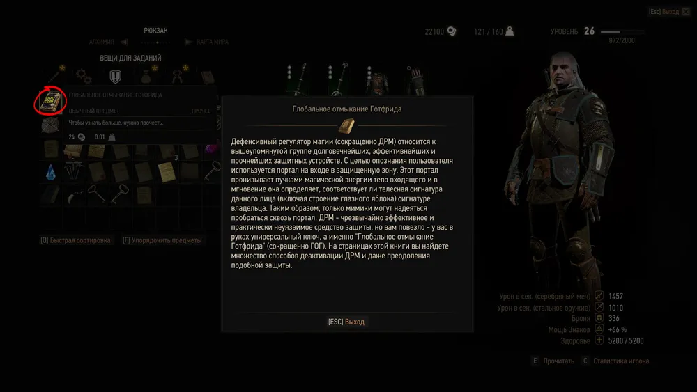 Внимание. Оказавшись вне досягаемости ядовитых паров, загляните в Инвентарь, в отдел для квестовых предметов, и прочтите найденный фолиант. Зацените, вам в руки попала превосходная пасхалка на сервис цифровой дистрибуции GOG.com, продающий игры без DRM защиты. Ознакомьтесь с ней до того, как передадите ее магу. Потом ее у вас уже не будет.