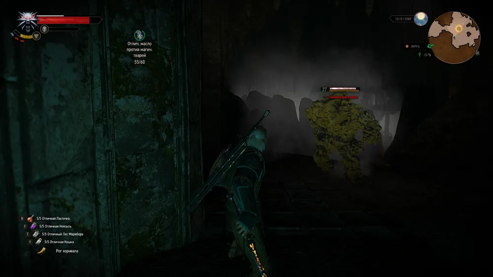Пройдя портал, Геральт окажется в каком-то темном, но довольно просторном помещении. Строгий голос сообщит, что в башне обнаружен нарушитель, а потом активируется голем 29 уровня, это самое помещение охраняющий. Придется его ушатать. Масло от магических тварей вам а помощь.