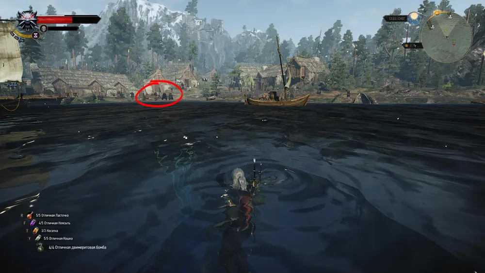 2. Решив помочь Тиммону, отправляемся в восточную часть Фарер. На берегу к северо-востоку от Троттхейма Геральту попадутся две сирены 13 уровня с уполовиненными полосками здоровья, пирующие человеченкой (5).