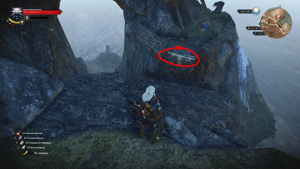 Внимание. После того как Геральт узнает поподробнее про обе части испытания, он сможет непосредственно к нему приступить: «Я хочу попробовать». Хотя игра первым делом велит вашему герою отправиться на вершину горы, на самом деле нет особой разницы, в каком именно порядке будут пройдены испытания. Можете, коли вам так угодно, начать с дайвинга (см. ниже п. 5), а потом уже заняться восхождением.