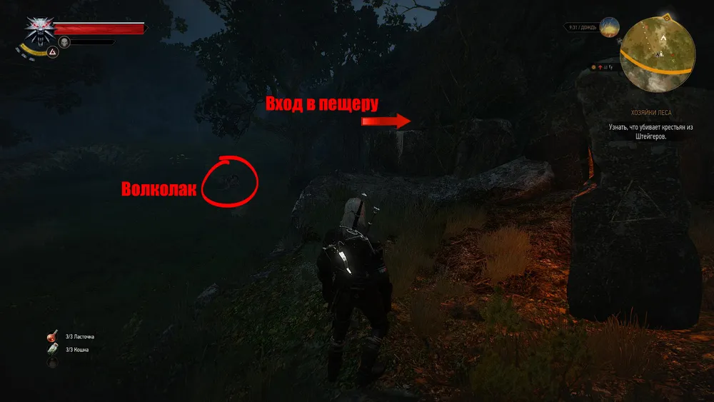 1. Чем ближе ведьмак подходит, тем явственнее слышится голос, идущий из недр земли и требующий повернуть назад, но Белый Волк не привык отступать. В склоне холма есть вход в пещеру (24), охраняемый волколаком. Плохая новость - у этой твари повышенная способность к регенерации. Хорошая новость - поблизости есть Место силы, усиливающее знак Игни. Первым делом активируем Место силы, затем выбираем в круговом меню знаков Игни, и только после этого идем мочить волчишку. Комбинация огня и сильных ударов серебряным мечом не оставит ему шансов. Для быстрого пополнения энергии советую еще и Неясыть (Филин) накатить. Хотя, если постараться, волколака можно и обойти, но тогда нам не достанутся дропающиеся с него алхимические ингредиенты.