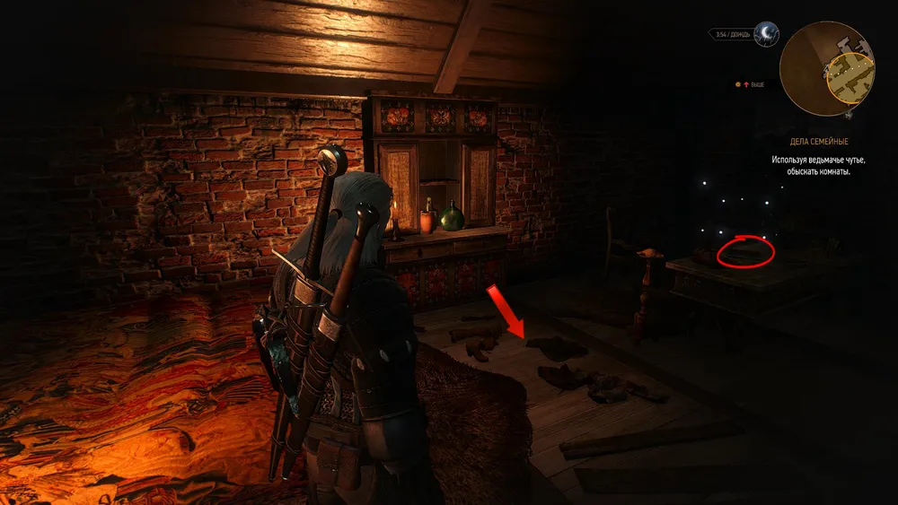 Под конец стоит еще раз осмотреть с помощью ведьмачьего чутья стол со сломанным подсвечником. И стол, и пол под ним - все заляпано разлитым вином. Стойкий винный запах витает в воздухе. Геральт снова берет след, который обрывается на лестнице между первым и вторым этажом. Там же на одной из половиц он найдет странный талисман или оберег. Кажется, на этом осмотр можно завершить. Самое время вернуться к барону и обсудить промежуточные результаты расследования.