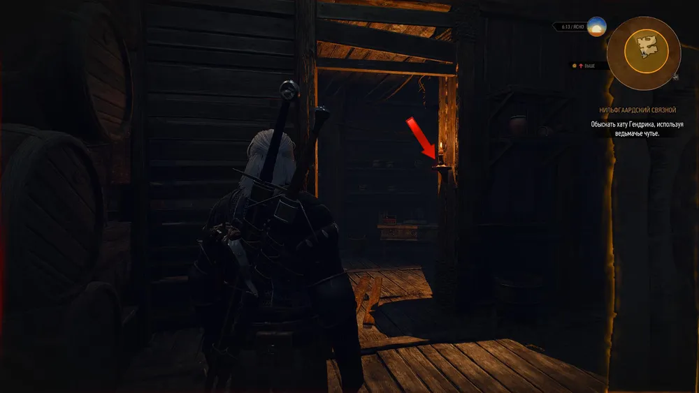 3. Окровавленное тело Гендрика обнаружится в доме, где он жил. В башмаке трупа Геральт найдет ключик. Какой же замочек он открывает? С помощью ведьмачьего чутья наш герой сумеет разглядеть прикрытый соломой люк, ведущий в погреб. Внизу, опять же не без помощи спецчутья, ведьмак обратит внимание на подсвечник, торчащий в дверном проеме. Достаточно до него дотронуться, как откроется тайник.