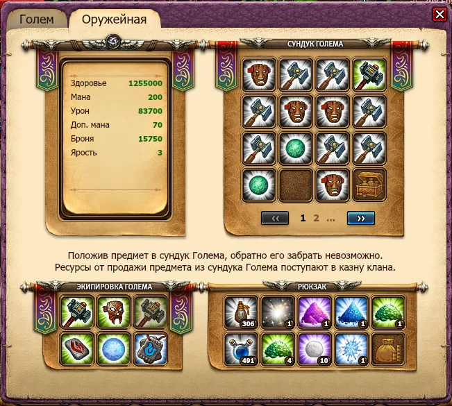 Вкладка "Оружейная" видна всем членам клана, она специально предназначена для передачи предметов (передавать можно только предметы для Голема) из рюкзака персонажа в сундук голема (помните, что обратный процесс невозможен).