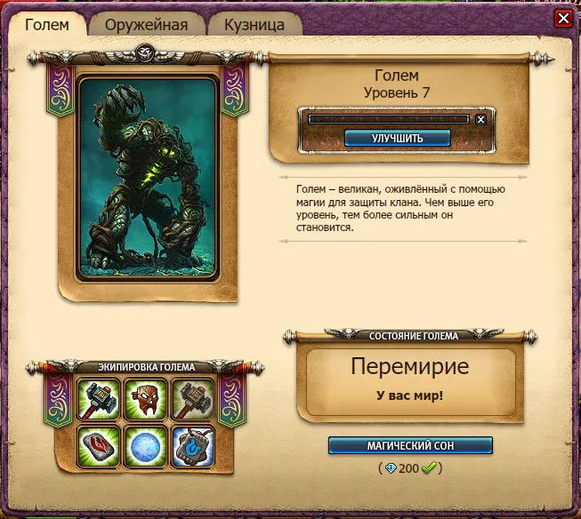 Меню голема имеет три вкладки: Голем, Оружейная и Кузница.