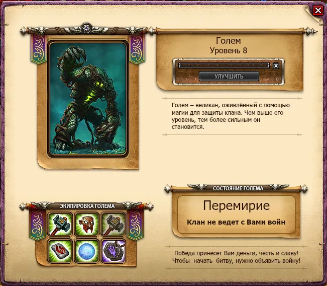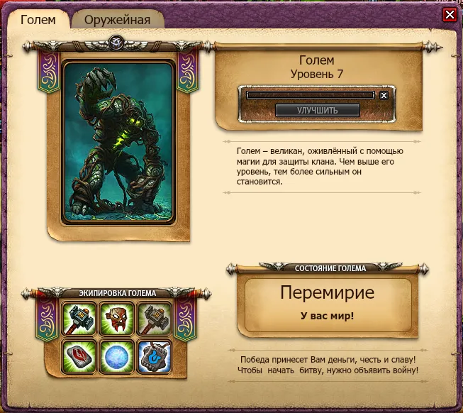 Кликнув на Голема - откроется вкладка и вы увидите, что можете им управлять. Можно улучшать кланового защитника, просматривать инвентарь, а также просматривать в каком он состоянии: "войны", "мира" или "готов к бою" (еще Голема можно погрузить в "Магический сон"за 200 бриллиантов). Но только Глава клана может улучшать Голема и ускорять/отменять это улучшение (отмена улучшения возвращает казне клана всего 75% от потраченных средств, все средства при улучшении списываются только из казны клана), остальные в любой момент могут просмотреть информацию об уровне и прогрессе улучшения.