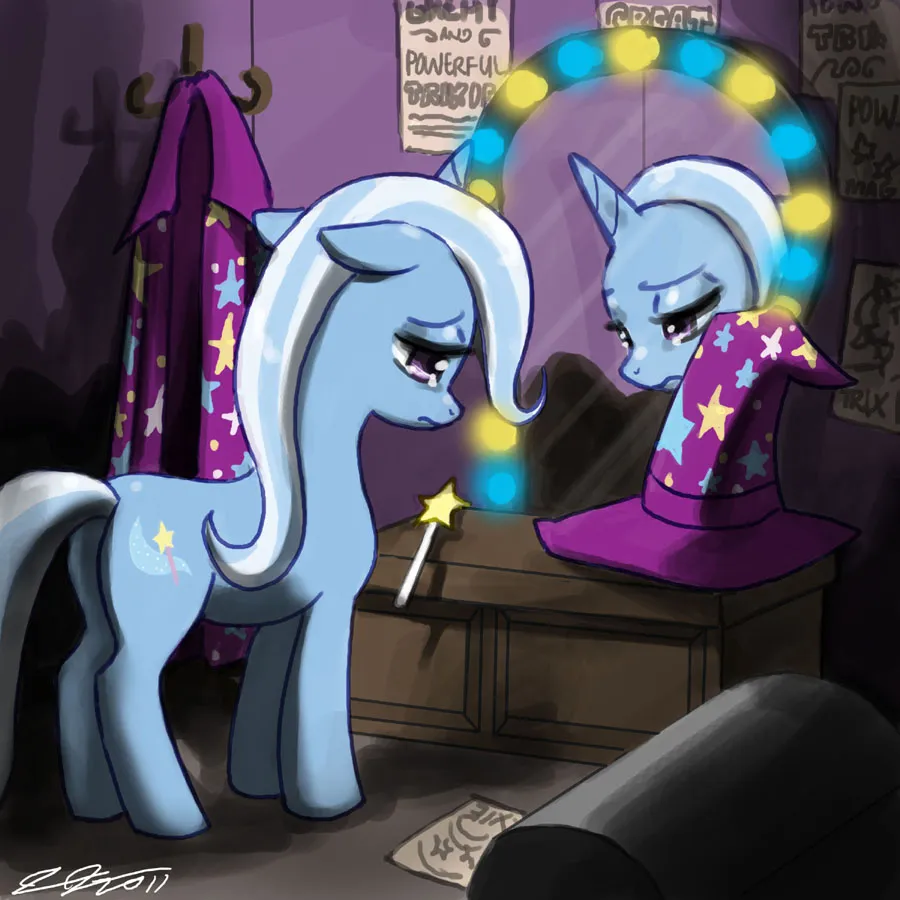 Выпрягшись, Трикси юркнула в свой вагончик представлений, нашла там зеркало и несколько раз громко произнесла «Я великая и могучая Трикси!» Это всегда помогает. Обретя уверенность, она вновь запряглась и поехала в город. Понивилль падет к ее копытам!