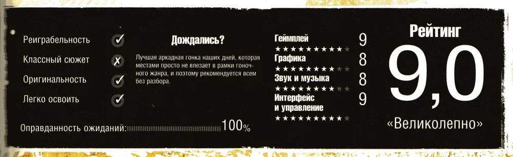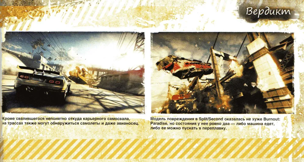 Может показаться, что, как и любой другой постановочный аттракцион, Split/Second — сугубо одноразовое развлечение. Но в него хочется играть еще и еще. Здесь нет абсолютно ничего, что бы хоть сколько-нибудь раздражало (если не считать долбящего по ушам электронного саундт-река) или было сделано спустя рукава. В свое время многие отвернулись от Burnout: Paradise только из-за того, что он разменял плотность и постановку на свободный город с полупустыми улицами. Это было по-своему интересно и не сделало игру хуже, но когда на ее место пришел линейный и стремительный Split/Second — звание лучшей аркадной гонки придется уступить ему. Прости, Burnout!. ■