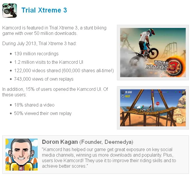 Пока Kamcord может похвастаться 1 млн записанных и распространенных с помощью ее сервиса видео за прошлый месяц. Если рост продлится, то скоро эта компания сможет соперничать с Twitch. Впрочем, пока запись видео на смартфонах и планшетах не приобрела столь массового характера, как на компьютерах и консолях.