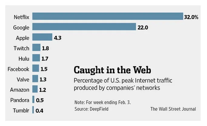 Twitch начинал как сервис для потоковой трансляции киберспортивных мероприятий. Буквально за три года этот канал стал главным источником видеоигрового контента для увлеченных пользователей. 40 млн зрителей в среднем смотрят по полтора часа видео в месяц. Twitch остается четвертым самым крупным источником трафика в США, уступая лишь Netflix, Google, и Apple. Во время пиковых нагрузок на долю сервиса приходится около 1,8% общего трафика в стране.