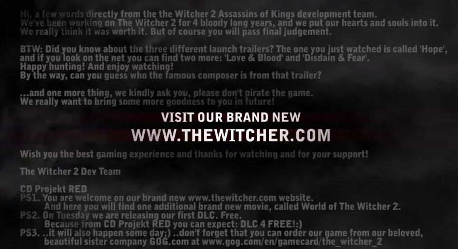 Кроме того CD Projekt RED просят не пиратить Ведьмака 2, потому что они очень хотят поддерживать честных игроков в будущем. И чтобы слова не расходились с делом анонсировали первое бесплатное DLC уже в ближайший вторник "потому что от CD Projekt RED вы можете ожидать бесплатные DLC" (цитата).
