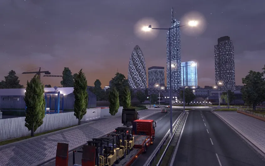Группа лондонских небоскребов в реальной жизни выглядит немного иначе, чем на скриншоте игры Euro Truck Simulator. Например, небоскреб «Мэри-Экс», прозванный в народе «корнишоном» (слева), уже существует, а башня «Бишопс-гейт» (в центре) еще не достроена.