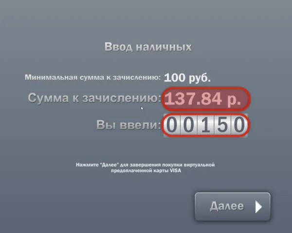 6. Внесите денежные средства. Внесенная сумма и сумма к зачислению (за вычетом комиссии) будут отображены на экране.