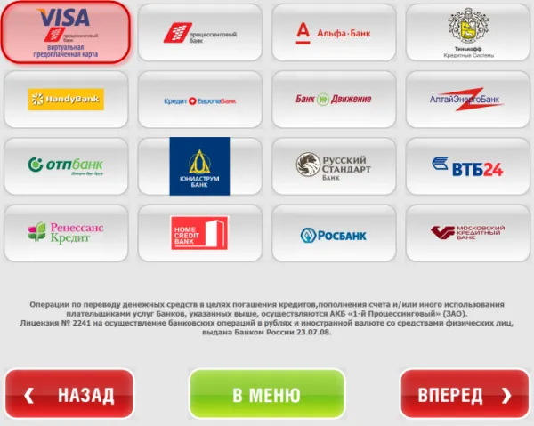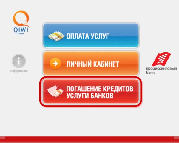 1. В главном меню выберите кнопку с надписью «Погашение кредитов. Услуги банков» (или кнопку «Оплата услуг», далее «Погашение кредитов. Услуги банков»).