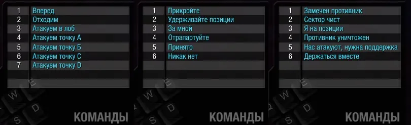 В битве кнопками Z & X & C вызывается подменю голосовых команд. Все команды озвучены профессионалами с наложением эффекта радио. Помимо озвучки команды также высвечиваются в командном чате.