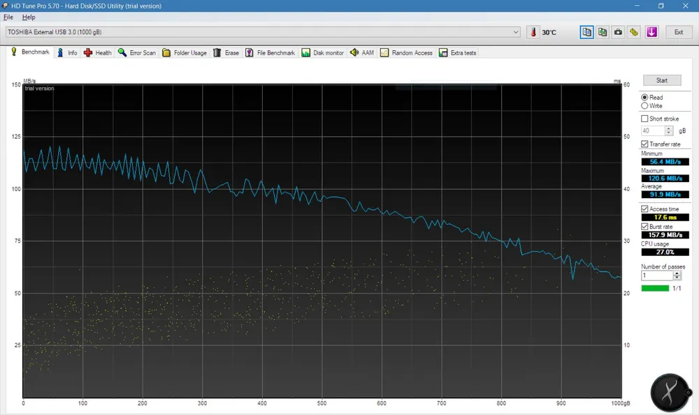 Оценим возможности диска при помощи программы HD Tune Pro и утилиты CrystalDiskMark. Диск уже используется и хранит кое-какие данные, поэтому будет проверена только скорость чтения (для остальных тестов, на скорость записи, требуется пустой диск).