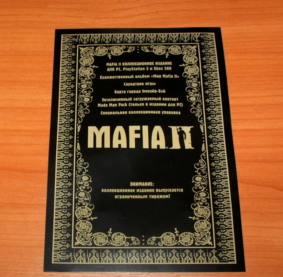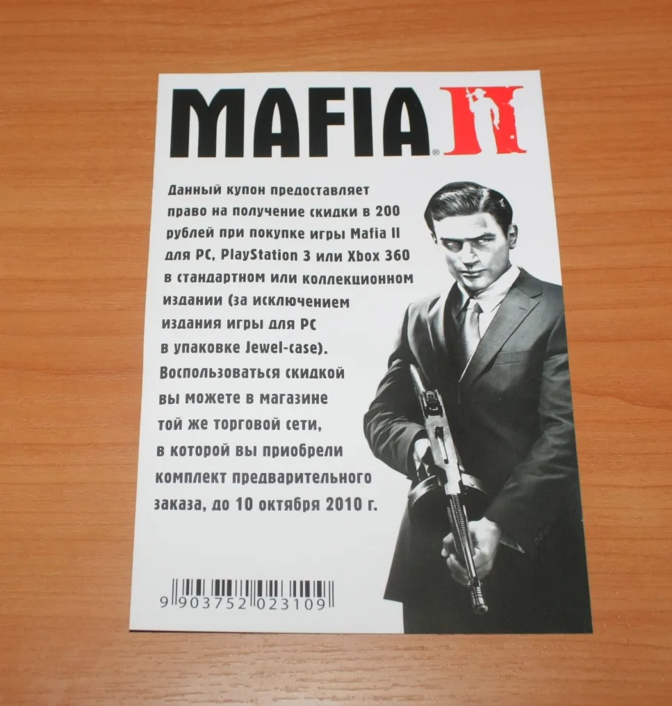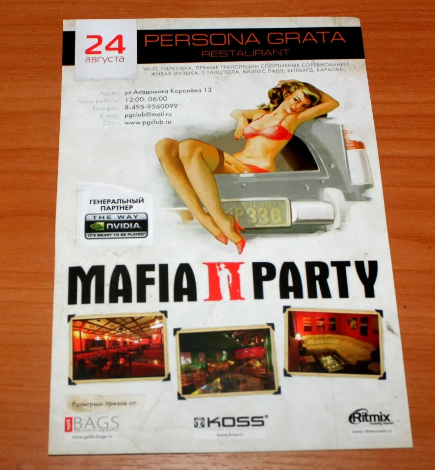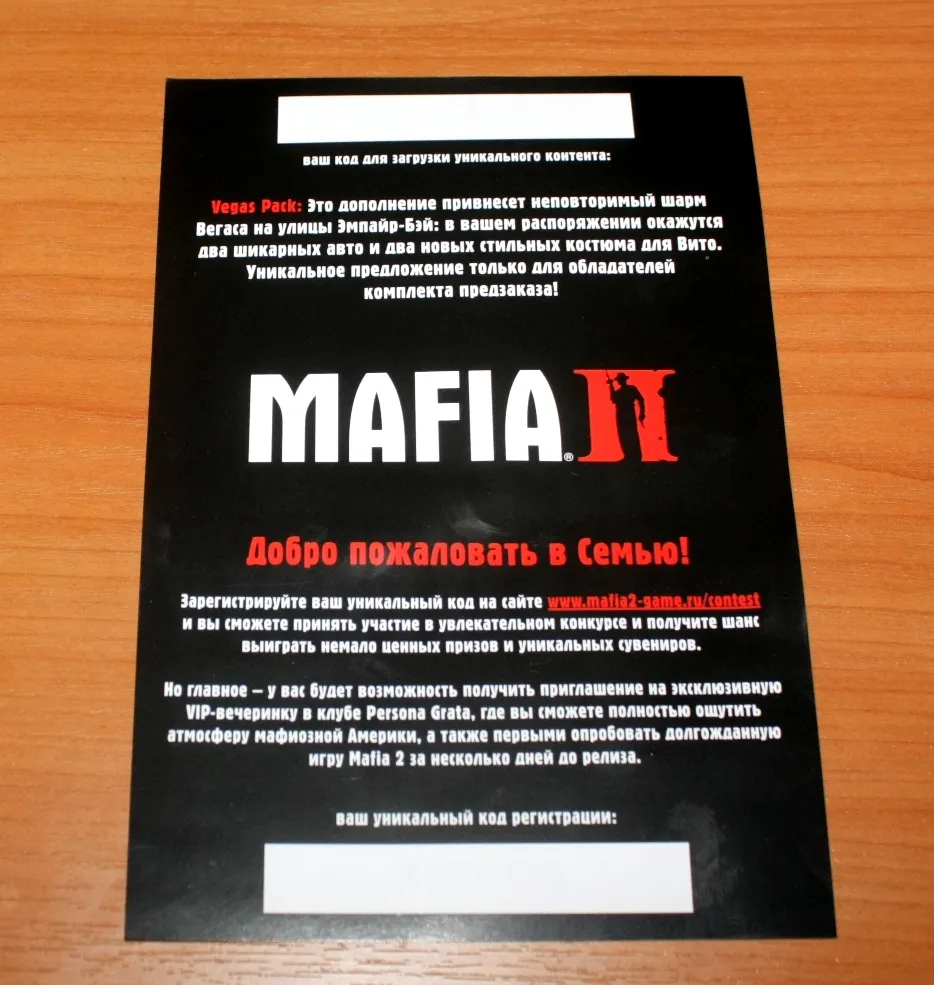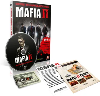 Вторая листовка - сюрприз! - рассказывает о вечеринке Mafia II в московском клубе Persona Grata. Mafia II Party состоится 24 августа. Обещаются и призы, и возможность лично оценить игру до релиза. Подробностей на официальных сайтах пока нет. Чтобы попасть на эту вечеринку, нужно ввести код с обратной стороны в специальном разделе официального сайта, который пока не запущен. Помимо приглашений на вечеринку, будут и другие подарки для участников.