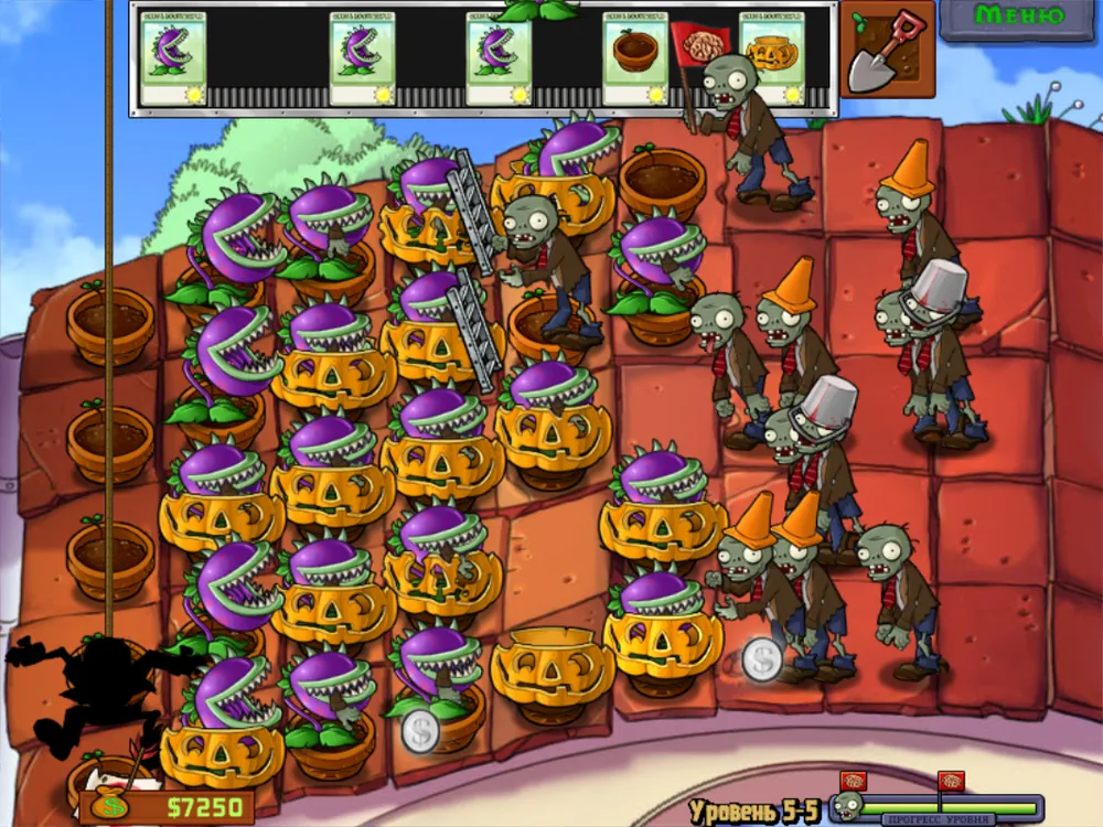 Больше всего удивила меня крыша, на которой значительно сложнее бороться с хитрыми зомби. Из-за неестественного покрытия растения можно выращивать только в горшках. Так-же, крыша наклонена и единственные растения,которые могут атаковать зомби на наклонной поверхности - капустопульты, зернопульты и арбузопульты. Хорошо отметились вторые: время от времени они бросают смачный кусок масла, тем самым останавливая неприятеля. А как бороться с зомби на тарзанке я так и не понял, но пройдя ещё пару уровней сообразил, что вишенки и пальмы-зонтики прекрасно справляются с этой задачей.