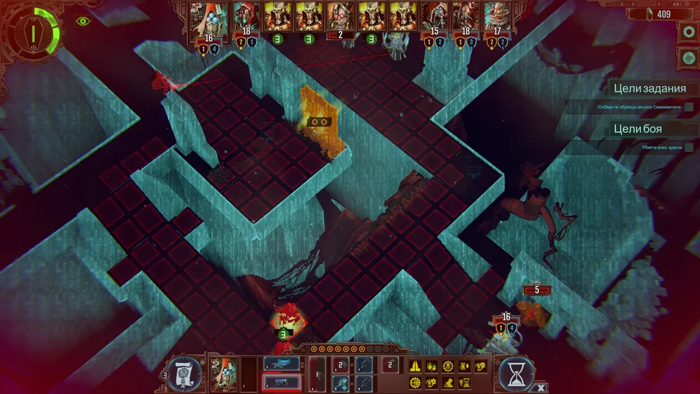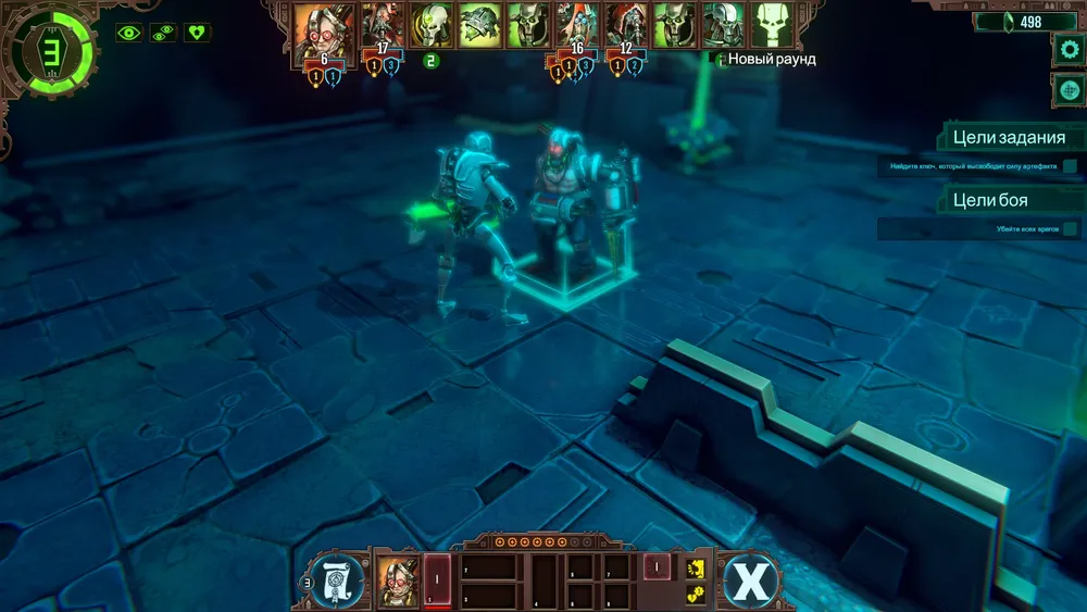 Выбираем миссию, собираем отряд из доступных техножрецов и сервиторов и вперёд. Загружается экран миссии, и мы наблюдаем за отрядом (в игре он называется когортой) сверху. Прорисовывается план данной части гробницы.