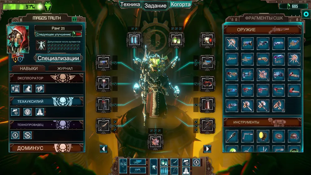 Nota Bene. На мой взгляд, самая лучшая ветка у доминуса. Он специализируется на «стрелковом» оружии, а ультимативный навык повышает урон и дальность передвижения при отсутствии в руках топора. Также очень полезна ветка лексмеханика, позволяющая «выкачивать» при помощи черепа все ОП (порой их может быть и 2 и 3) из одной стелы, перезаряжать шкалу ОП. В остальных ветках, кроме Секутора есть довольно полезные навыки в начале или середине. Секутор, отвечающий за усиление сервиторов практически бесполезен, поскольку даже с бонусами сервиторы очень сильно уступают жрецам по своим возможностям.