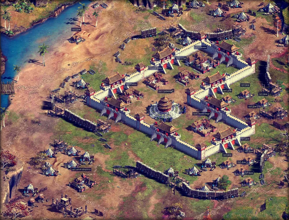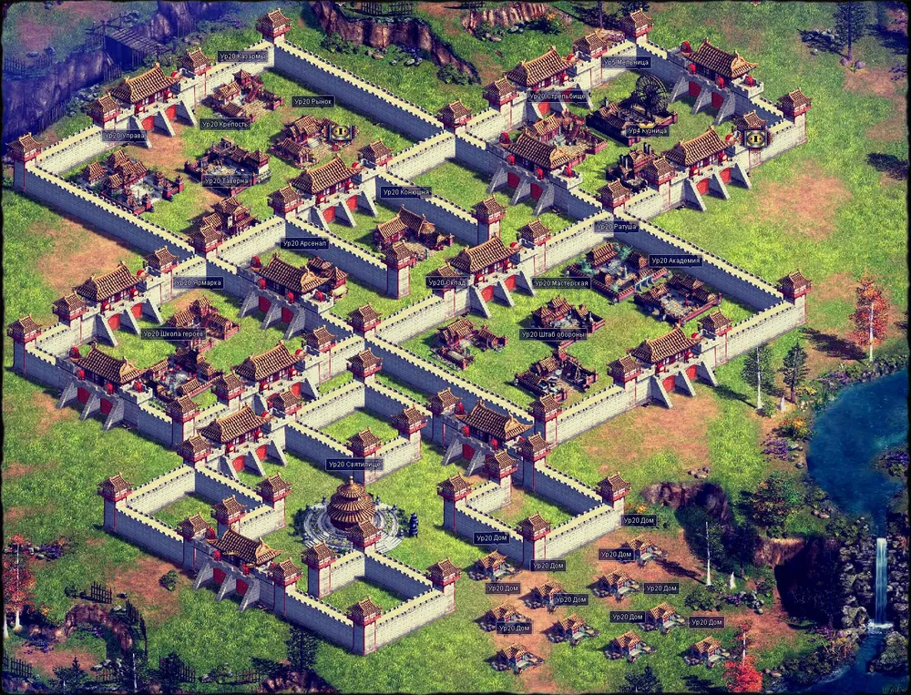 Основные постройки доведены до максимальных уровней. Отсутствует только Монумент Героя, который требуется на ранних стадиях развития.