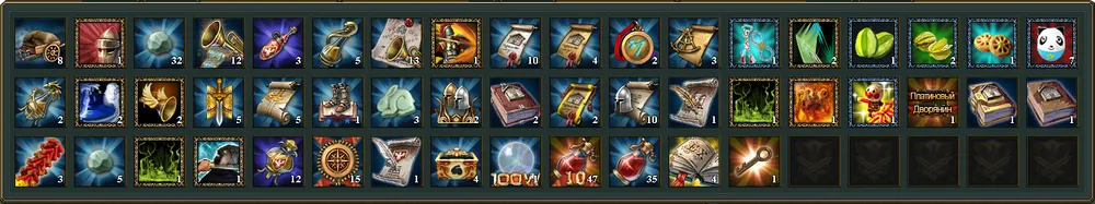 Для того, чтобы не быть голословным, покажу содержимое своего инвентаря, в котором скопилось очень много полезного: от свитков опыта и увеличения скорости строительства, до Золотой Карты и Бога Войны.