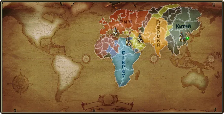 Значится, что и действие игры разворачивается в этот период времени, посему Вы не увидете на карте мира ни Азии в её привычном облике, ни тем более Европы - три огромных материка разделены на четыре Государства-Империи: Египет, Рим, Персия и Китай. Выбрав одну из сторон нам предстоит превратиться из главы маленькой деревеньки в могущественного правителя, взвалив на свои плечи ношу дипломатических отношений и глобальных войн.