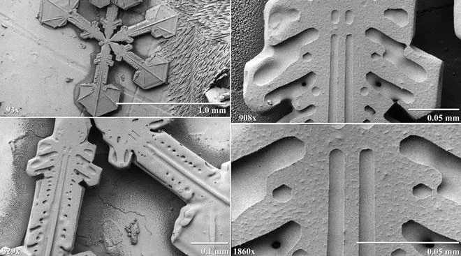 Это без сомнения на наше благо. Но ведь вас интересуют только снежинки, верно? =) Для снятия данных снимков, были использованы низкотемпературные сканирующие электронные микроскопы. Результат получился просто поразительным, под микроскопом они образуют невероятные узоры, лишь отдаленно напоминающие снежинки. Смотрим: