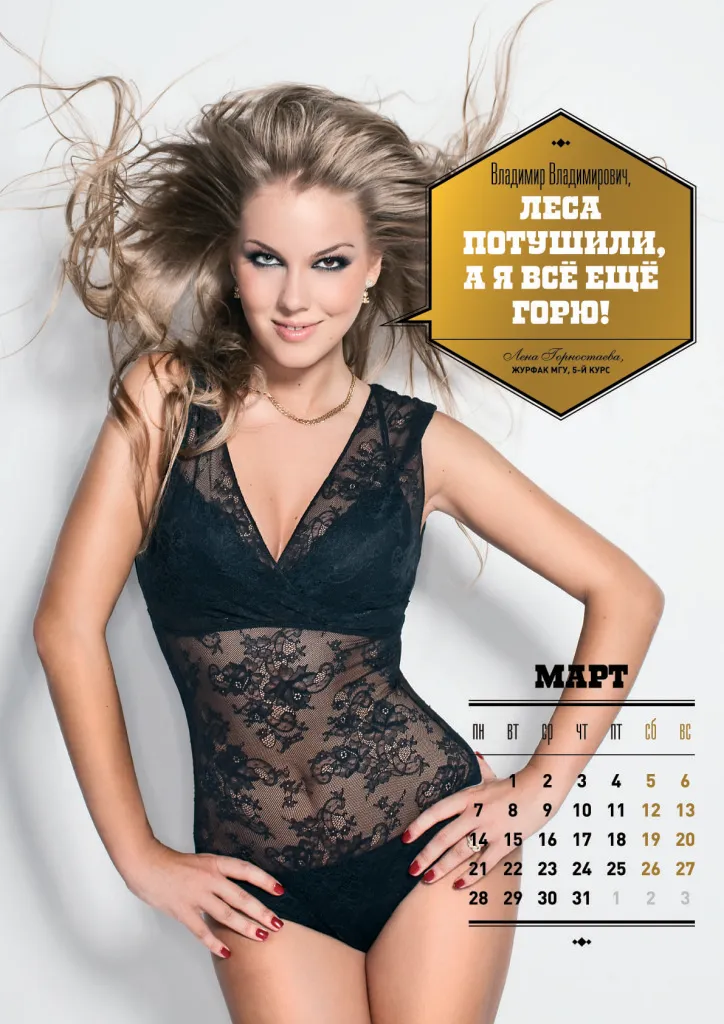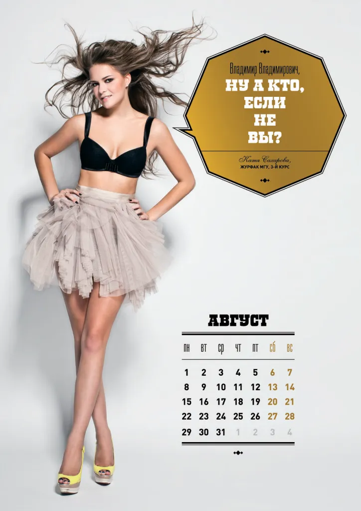 Календарь на 2011 год отпечатан тиражом 50 тысяч экземпляров. На каждой странице размещено по одной фотографии студенток в нижнем белье и личное обращение к премьеру.