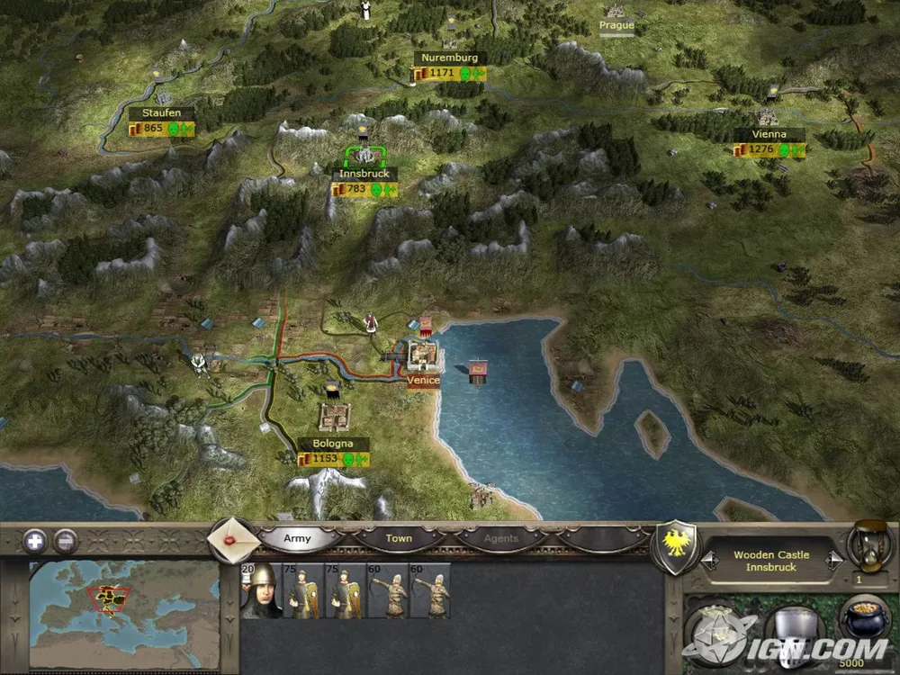 Войска на боевой карте были еще двухмерными (спрайтовыми), но тогда смотрелись очень мощно. Посмотрев сейчас на карту кампании, видно, что она была очень схематичной. Детализация и объем карты пришли лишь в “Риме”.