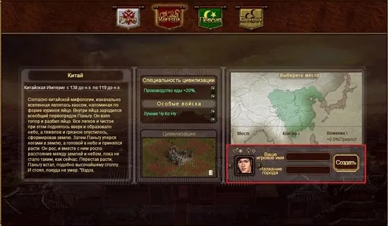 3. Выберите персонажа и его пол. Введите имя героя и название города в соответствующих окнах и нажмите «Создать». Теперь Вы можете начать свое путешествие в «Войны Империй»!