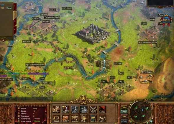 Мини-карта. Рядом с мини-картой расположены мини-кнопки ?. Это список всех городов, избранные координаты, показать/скрыть врага, показать/скрыть область постройки и очень полезная кнопка карта мира (в виде +). С помощью этой кнопки Вы можете попасть в любую область мира одним кликом!