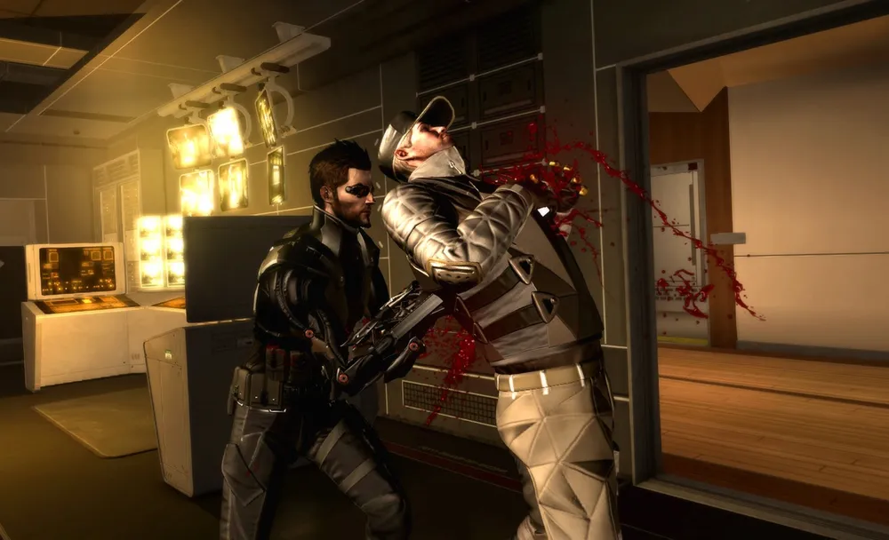 Одно из первых заданий отлично дает представление о возможностях главного героя. Адаму необходимо проникнуть в квартиру одного из подозреваемых и достать из его компьютера нужные данные. В свое время я не прокачал навык взлома, поэтому пройти самым простым путем не получится: уровень защиты местного дома слишком высок для такого начинающего хакера, как я. Остается только один вариант – попробовать найти альтернативный путь. И будьте уверены, что он есть абсолютно в каждой миссии. Все верно: чтобы проникнуть в квартиру, мне потребовалось забраться на соседнее здание, с него перепрыгнуть на другое, а там просто спуститься на нужный этаж. Процесс взлома системы защиты лишь изначально кажется чем-то сложным и запутанным, на деле же это банальная игра на скорость: требуется хакнуть терминал за ограниченное время (то есть добраться от порта ввода-вывода к регистру, захватывая узлы системы). Вот мы проникли в помещение, получили доступ к компьютеру, и вроде бы все идет по плану, но нет – в квартиру врывается посторонняя личность, явно испытывающая к ее хозяину ненависть. Выйти и представиться мы, сами понимаете, не можем, поэтому есть такой выбор: либо просто грохнуть беднягу, либо пожалеть его и «отключить». Возможностей расправиться с врагом тоже очень много: от простого выстрела в голову до зрелищного «фаталити», которому не стыдно показаться даже в монструозной Mortal Combat. Зайдя к недругу со спины, жмем специальную клавишу, чтобы Адам оглушил противника, хорошенько стукнув того по голове. При этом оппонент очнется через некоторое время. Зажав ту самую специальную клавишу, главгерой жестоко прикончит цель своими внушительными клинками, спрятанными в механических руках.