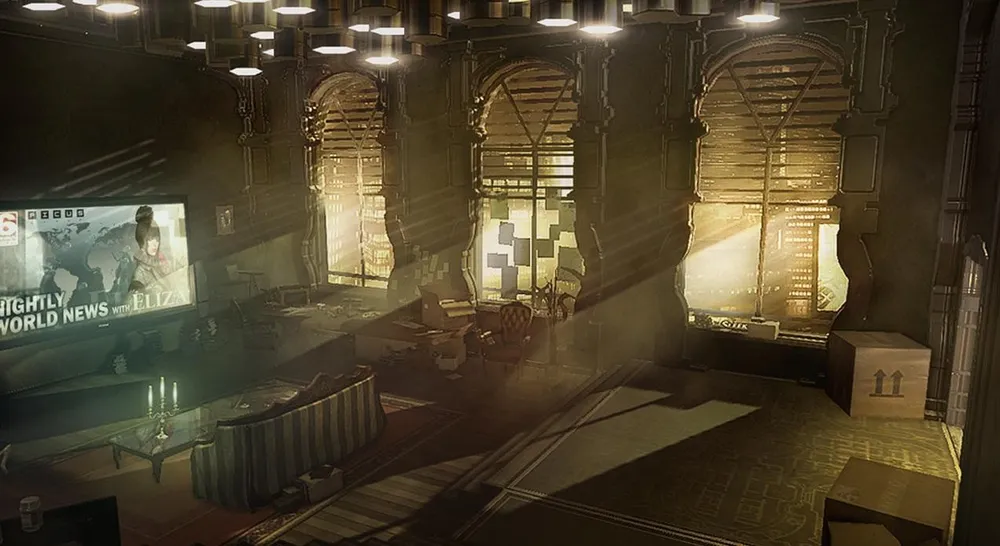 Будущее, как предсказывают сотни разномастных сценаристов, не сулит человечеству ничего хорошего. В Eidos не стали изобретать велосипед, а взяли вполне себе привычную нам концепцию киберпанка. Впрочем, не так уж часто нам доводилось попадать в антиутопические миры, а наш расширенный кругозор, если таковой имеется, больше благодарен литературным произведениям признанных авторов жанра. Вдобавок к обоюдному прогрессу и регрессу общества Eidos добавили и черты Эпохи Возрождения, соединив, таким образом, два совершенно разных временных исторических отрезка. Ренессанс 2027 года прекрасно нашел свое воплощение в Human Revolution, обратите внимание только на предметы мебели, интерьер некоторых комнат и такие, вроде бы и незаметные, но очень характерные для своего времени подсвечники. Стоит выйти на улицу, как нам представится шикарный вид на мегаполис будущего. Не такого уж и далекого будущего, замечу. Развитие техники и общий скачок науки вперед оставили свои отражения и на облике города. Даже туалеты стали «идти» в ногу со временем, предоставляя своим пользователям широкие информационные табло со свежими новостями.