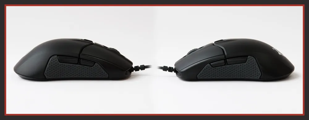 Корпус Sensei 310 изготовлен из черного матового слегка шероховатого фиброармированного пластика. С одной стороны, он, конечно, не столь нежный и шелковистый на ощупь, как софт-тач покрытие, а с другой, гораздо менее маркий и не рискует начать облезать при длительном и интенсивном использовании. По обоим бокам имеются вставки из серого силикона с текстурой в виде маленьких трехлучевых звездочек, препятствующие выскальзыванию мыши даже из потной руки. Из аналогичного материала того же серого цвета сделана и верхняя поверхность колесика, но рисунок насечек на ней другой. Единственными украшениями устройства являются два светящихся элемента – логотип на спинке и полоса на колесе прокрутки. Режим свечения каждого из них настраивается отдельно через приложение SteelSeries 3 Engine. Функция подсветки исключительно декоративная, никакой информационной нагрузки она не несет. По форме Sensei 310 абсолютно симметрична, и одна ее половина является зеркальным отражением другой. В руке девайс лежит хорошо, его размера вполне хватает под мою средних размеров кисть. Несмотря на то, что производитель рекомендует данную модель для хвата кончиками пальцев и «когтевого», она вполне годится и для ладонного хвата, причем, на мой взгляд, даже в большей степени, чем для пальцевого (для него она длинновата). Лично же мне после полугодового юзания Rival 500 обозреваемый Sensei показался непривычно легким и не столь удобным, как асимметричная и заточенная под правшей пятисотка.