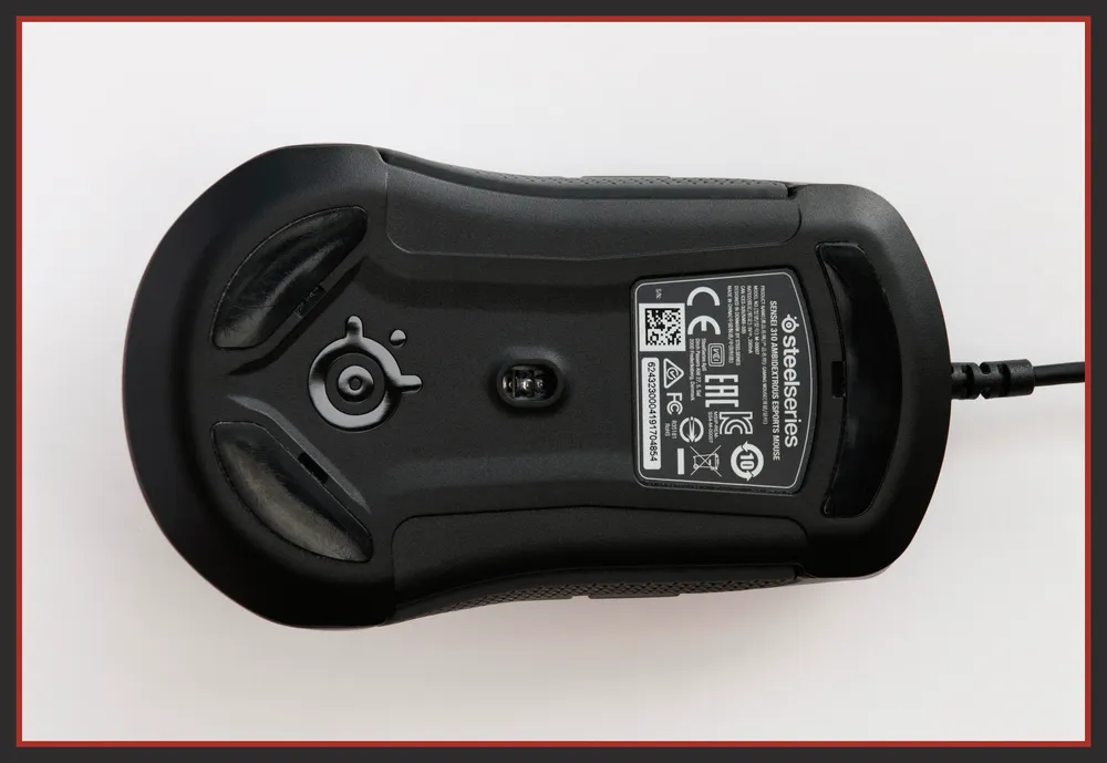 Основание Sensei 310 имеет стандартный для большинства мышей SteelSeries вид. Три тефлоновые ножки (две поменьше сзади и одна большая спереди) с пазиками, облегчающими их замену, окошечко сенсора (посередине), наклеечка с логотипом, серийным номером и прочей технической информацией в передней части брюшка и выгравированный логотип на задней – вот, собственно, и все. Кабель длиною 2 м лишен оплетки (типичная ситуация практически для всех проводных устройств SteelSeries), но при этом снабжен хорошей защитой от перегиба. Жесткость у него средняя, и свою форму он меняет неохотно. В сложенном состоянии шнур удерживается скрученной проволокой. Заканчивается он непозолоченным USB разъемом, возле которого приклеен ярлычок, напоминающий о необходимости загрузить фирменное ПО.