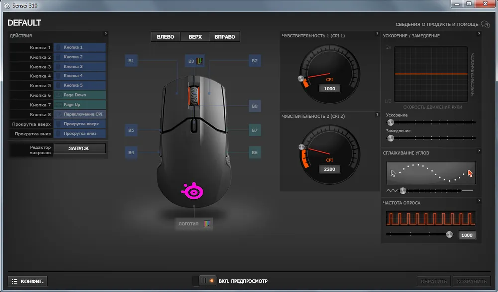 Щелкнув на панельке с названием модели вашего устройства, вы откроете окно настроек. Справа от изображения мыши располагаются инструменты, управляющие ускорением/замедлением курсора, сглаживанием углов, частотой опроса (варьируется от 125 до 1000 Гц) и чувствительностью сенсора. Для регулирования последнего параметра предусмотрены два круговых ползунка. С их помощью можно задать два значения cpi, за переключение между которыми отвечает (по умолчанию) кнопка над колесиком. Доступный диапазон значений – от 100 до 12 000 cpi при шаге в 100 единиц.