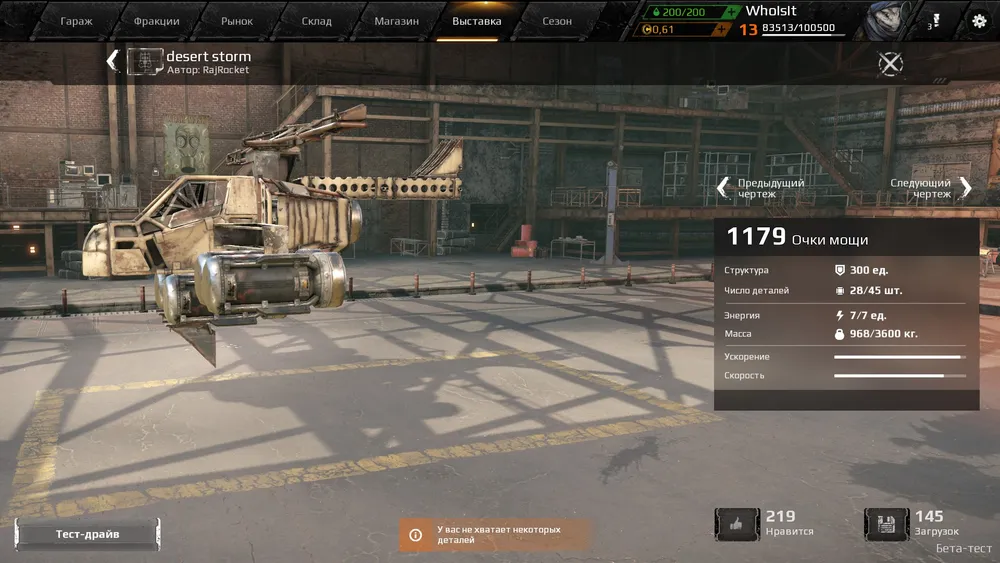 Если не бросаться в омут игры с головой, абстрагироваться от недостатков, или, по крайней мере, относиться к ним по-философски - бета-тест всё-таки, игра производит приятное впечатление. Вполне можно уделить ей пару-тройку часов в день - провести время за довольно-таки весёлым занятием - отстрелом запчастей от вражеских машин. А можно предаться чувству прекрасного, разглядывая скрины чужих крафтов(любой можно выложить на всеобщее обозрение - поучаствовать в конкурсе на лучший) или создавая свой собственный. Я бы поставил игре 7/10, бал пока накинул авансом. Надеюсь, что игра преобразится со временем и обрастёт собственным лором и большим числом фанатов.