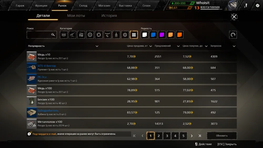 Единственный минус - рынок сейчас лихорадит, кажется, цены падают на всё, кроме бензина(м.б. также легендарных и реликтовых деталей, но думаю это вопрос времени) и то, он не дешевеет лишь потому, что недавно сильно сократили его получение в миссиях.