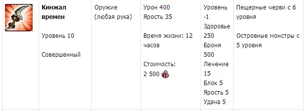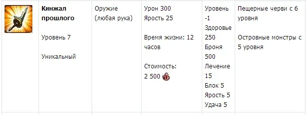 1. Кинжал прошлого – это оружие одноручное оружие (то есть данный предмет можно вставлять в один из двух слотов и он будет занимать только его) базовые характеристики будут приведены ниже . Найти этот кинжал можно будет у островных монстров и в пещере у червей, начиная с шестого уровня.