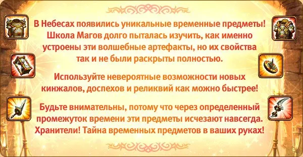 И вновь няшки. И снова гильдия магов радует своих игроков новинками в игре, на этот раз обновления затронули предметы экипировки персонажей, в данном случае речь пойдет о доспехах, оружие и реликвиях. Сравнивать эти новые предметы с теми, что уже есть в игре, мы не будем, ведь они действительно хороши на любых уровнях. У них довольно не плохие характеристики, но есть один минус, они временные. Не то чтобы они были временными в игре, а просто время действия предмета составляет всего 12 часов, и смысла держать его в сундуке, нет, абсолютно никакого. А также их нельзя будет выставить в свой магазин для продажи другим хранителям.