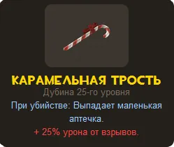 Карамельная трость делает вас более уязвимым к повреждениям от взрывов, а именно: ракет, пайп, гранат, ракет турелей.